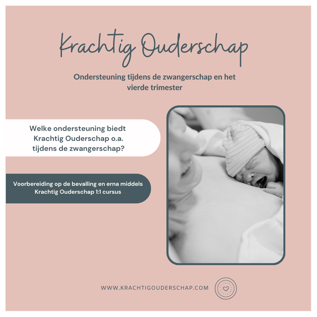 Na de bevalling plannen we nog een afsluitend consult. We bespreken hoe het gaat, waar je tegenaan loopt en waar je eventueel nog sterker in wilt worden. Een extra consult is altijd bespreekbaar, zodat jij de steun krijgt die je nodig hebt. Volg jij de eendaagse cursus Krachtig Ouderschap? Dan zit hier niet standaard een consult na de bevalling bij.